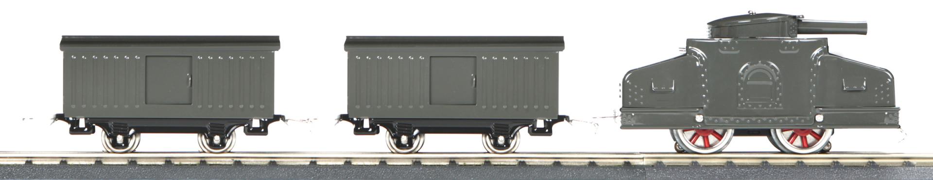 Making its debut in 1917, the 214 Armored Motor Car Outfit offered boys the chance to be a general "just like the solders in Europe". Comprised of the 203 motorcar and two #900 ammunition cars, outfit No. 214 operated on O-Gauge track, had two 6" long cars originally painted in Battleship Gray, and included eight sections of curved track. A second run was later released in Olive Green.