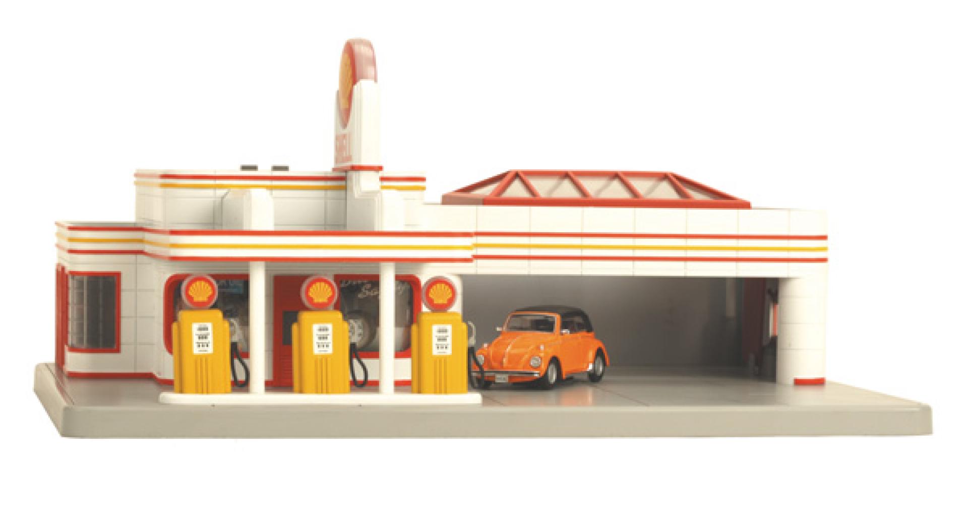 The full service of the Operating Shell Service Station arrives with all the Art Deco looks that made the service stations of the fifties so unique. Featuring a die-cast Volkswagen, lighted Shell signs and gas pumps, this operating accessory brings the service station to life at the touch of a button. When activated, the station's bay door rises to reveal a gleaming Volkswagen inside. The classic slowly pulls out of the bay and heads for the pump island for a fill up. It's all accompanied by the classic sounds of a service station, including the bell as each gallon is pumped. It's sure to be a favorite on your layout. Measures Approximately: 15" x 11" x 6 1/2"